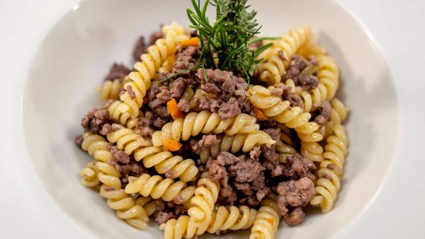 Spaghettoni rigati con ragù bianco di carne e salsiccia al curry e foglie di salvia fritte